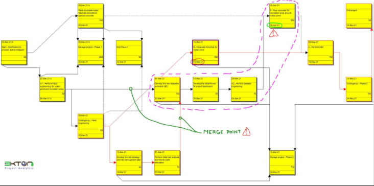 That is not all. The activity (Develop the new baseline) is at a merge point, which makes it even more unlikely to start on March 23, due to the risks/uncertainties affecting its predecessors.
